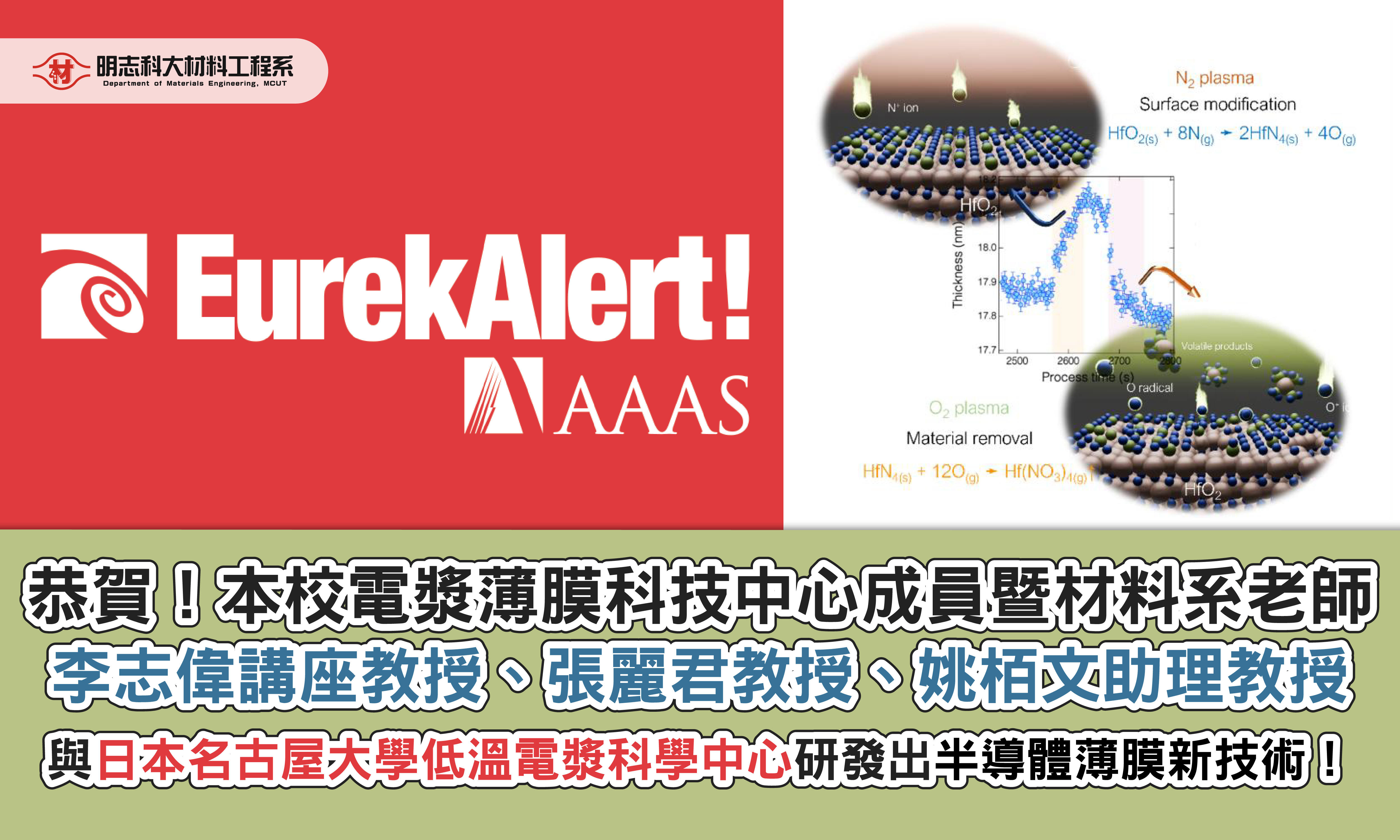 【最新研究】賀!本校電漿與薄膜科技中心與日本名古屋大學低溫電漿科學中心國際合作,一起發展出新穎的低污染半導體薄膜材料的蝕刻技術